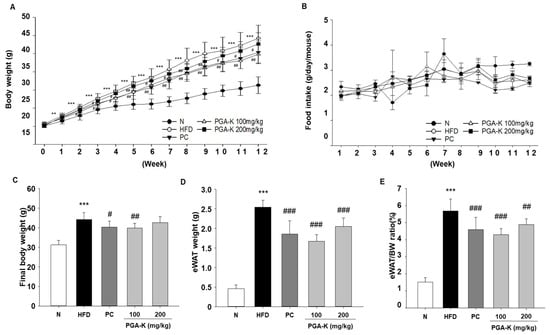 Effects of PGA-K on body weight and eWAT weight in HFD-induced obesity mice. (A) PGA-K effects on body weight gain, (B) food intake, (C) final body weight, (D) eWAT weight, and (E) the ratio (%) of eWAT to body weight for 12 weeks of obesity induction by HFD. The mean ± SD is represented by each value. For data analysis, Duncan’s multiple comparison test was used. ** p < 0.01 and *** p < 0.001, versus the N group; # p < 0.05, ## p < 0.01, and ### p < 0.001, versus the HFD group. PGA-K, poly-γ-glutamate potassium; HFD, high-fat diet; eWAT, epididymal white adipose tissue; N, normal; PC, positive control.