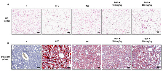 For histological analysis, the eWAT tissue was stained with H&E. In the epididymal fat of obese mice, adipocytes were abnormally enlarged, and some adipocytes were damaged (Figure 2A). In the group administered with doses of 100 and 200 mg/kg of PGA-K, adipocyte heterogeneity and hypertrophy were reduced compared to the HFD group (Figure 2A). To evaluate whether PGA-K inhibits HFD-induced hepatic steatosis, histological analysis was performed on Oil Red O-stained liver sections. The liver tissue of the HFD group showed numerous red lipid droplets with incomplete cellular structure and fat accumulation, which suggested that substantial accumulation of lipid occurred in the liver tissue (Figure 2B). On the other hand, both groups administered 100 and 200 mg/kg of PGA-K showed decreased cell deformation and lipid accumulation in liver tissue (Figure 2B). These results showed that PGA-K had a preventive effect on adipocyte hypertrophy and intrahepatic lipid accumulation in HFD-induced obese mice.