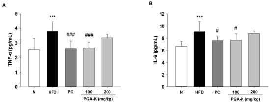 In order to comprehend the mechanisms behind obesity-induced lipid metabolism and inflammatory responses, we assessed the levels of inflammatory cytokines. In obesity, persistent inflammation is distinguished by aberrant expression of genes responsible for encoding pro-inflammatory cytokines [23]. Elevated levels of pro-inflammatory cytokines, such as TNF-α and IL-6, occur concomitantly with an increase in lipid content in white adipose tissue (WAT), contributing to the development of complications associated with obesity [24]. In this study, TNF-α and IL-6 levels were measured in serum using ELISA. The levels of serum TNF-α and IL-6 were notably elevated in the HFD group compared to the normal diet group (N). After administration of PGA-K for 12 weeks, TNF-α (Figure 5A) and IL-6 production (Figure 5B) decreased.