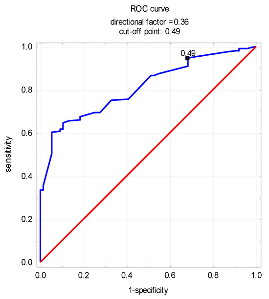When evaluating the risk of sarcopenia in the IBD patients based on ROC curves, it was not possible to assess the potential occurrence of sarcopenia by determining the levels of MSTN or Act A only. However, the log10myostatin-to-activin A ratio was shown to indicate the presence of sarcopenia in this group (cut-off point of 0.49, sensitivity of 93%, specificity of 69%; Area 0.810, p < 0.05) (Figure 1).