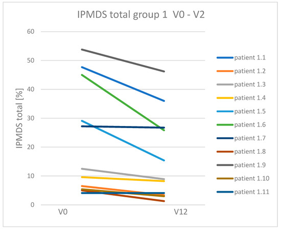 Clinical symptoms in MD patients treated and non-treated with KD were compared (group 1 vs. group 2). Group 1 with patients treated with KD, showed clinical improvement and reduction in symptoms compared to group 2. In nine patients receiving KD, the number of points on IPMDS was reduced (which means clinical improvement). In the other two patients in this group, the number of points did not change (their clinical condition was stable during the follow-up period). On the other hand, in group 2 (patients with MD non-treated with KD): two patients showed improvement; in one patient the condition was unchanged, and the other seven patients showed an increased number of points on IPMDS (which means worsening of clinical condition). Median points of IPMDS total in group 1 at V0 was 12.5% (4.1–53.8%), and at visit V12: 8.9% (1.3–46.2%). In group 2, the median points of IPMDS total at V0 were: 9.65% (3.2–33.2%), and at V12: 20.45 (2.9–47.7%) (Figure 2). The difference in IPMDS points in group 1 vs. group 2 was statistically significant (p = 0.0048) (Figure 3 and Figure 4).