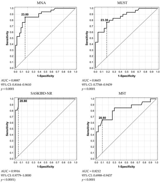 ROC curves were plotted to compare the applied malnutrition risk assessment tools with BMI. The largest area under the ROC curve was noted for the SASKIBD-NR test criteria (AUC = 0.9916; 95% CI: 0.9779–1.0000; p < 0.0001), followed by the MNA (AUC = 0.8887; 95% CI: 0.8164–0.9610; p < 0.0001), MUST (AUC = 0.8603; 95% CI: 0.7768–0.9439; p < 0.0001) and MST (AUC = 0.8212; 95% CI: 0.6988–0.9437; p < 0.0001) (Figure 1).