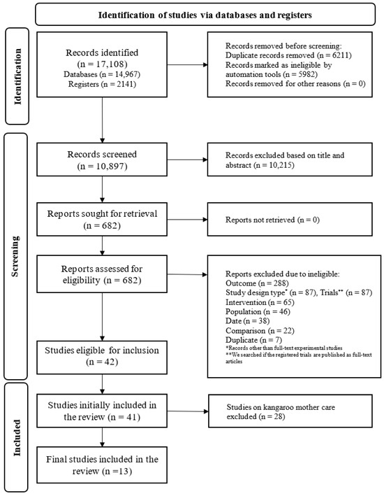 Search results and the process of selection are presented in Figure 1. We identified 17,108 records. After de-duplication and screening of records, 682 reports were assessed for eligibility. Of these, 640 reports were excluded. Finally, 42 studies were eligible for inclusion in the analysis; of these, two studies presented the same anthropometric data from a single trial [24,25], and henceforth were considered as a single study. Further, we excluded studies with kangaroo mother care (n = 28) as these were already covered in another WHO guideline update—WHO recommendations for care of the preterm or low birth weight infant while this review was ongoing [26]. Thus, 13 studies contributed to final synthesis.