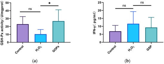 As shown in Figure 5a, the activity of GSH-Px in the GOP intervention group was significantly higher compared to the H2O2 model group (p < 0.05). As shown in Figure 5b, the IFN-γ concentrations of the H2O2 model group, the normal control group and the GOP intervention group appeared to have no significant differences (p > 0.05).