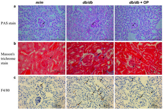 Diabetic nephropathy was characterized by expansion of the mesangial matrix, which eventually blocked the glomerular capillaries [10]. We found that the PAS-positive mesangial matrix areas (black arrows) were larger in db/db mice than in m/m mice. OP supplementation decreased the PAS-positive mesangial matrix areas (black arrows) (Figure 2a). By Masson staining, the db/db group showed increased renal fibrosis areas compared with the m/m group (black arrows). OP supplementation reduced the degree of renal fibrosis (Figure 2b). In addition, renal inflammation contributed to the progression of diabetic nephropathy [20]. F4/80 was a marker of macrophages. As shown in Figure 2c, the expression of F4/80 was higher in db/db mice compared with m/m mice (black arrows). In contrast, mice in the db/db + OP group showed fewer F4/80 positive areas than those in the db/db group.