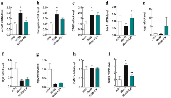Furthermore, mRNA levels of fibrotic factors (α-smooth muscle actin (α-SMA), transgelin, and the connective tissue growth factor (CTGF)) were assessed. The results demonstrated that the mRNA levels of α-SMA, transgelin, and CTGF were significantly upregulated in db/db mice compared with m/m mice (Figure 4a–c). However, OP treatment significantly decreased the mRNA level of α-SMA (Figure 4a). Nevertheless, the comparisons between db/db and db/db + OP groups in relation to transgelin and CTGF showed no significant differences (Figure 4b,c). We then investigated the effects of OP on the mRNA levels of anti-inflammatory and pro-inflammatory factors. Compared with the db/db group, the mRNA level of the anti-inflammatory factor mannose receptor C type 1 (Mrc1) was significantly upregulated (Figure 4d) in the db/db + OP group. Dietary intake of OP had slight but not significant effects on the mRNA levels of the anti-inflammatory factors arginase 1 (Arg1), macrophage galactose-type lectin 1 (Mgl1), and macrophage galactose-type lectin 2 (Mgl2), as well as on the mRNA level of the pro-inflammatory factor intercellular adhesion molecule-1 (ICAM1) (Figure 4e–h). We also investigated the effect of OP on oxidase-related genes. Compared with the mice in the m/m group, the mRNA level of NADPH oxidases 4 (NOX4) in the db/db mice was significantly increased. However, OP treatment significantly decreased the mRNA level of NOX4 (Figure 4i).