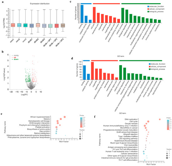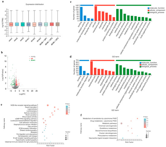 Changes in renal gene expression induced by OP in the mice. (a) Box plot indicating gene expression distribution for each sample; (b) volcano plot showing upregulated and downregulated genes induced by OP; (c,d) GO analysis of upregulated and downregulated DEGs in db/db + OP group compared with db/db group; (e,f) KEGG signaling pathway analysis of upregulated and downregulated DEGs in db/db + OP group compared with db/db group.