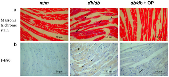 In our previous research, it was observed that mice in the m/m group exhibited neatly arranged myocardial fibers, whereas mice in the db/db group displayed disordered myocardial fibers. Following OP treatment, a notable improvement was observed, with more neatly arranged myocytes in the db/db + OP group [13]. We found that the cardiac fibrosis area in the db/db + OP group was smaller than that in the db/db group (Figure 6a). We also analyzed F4/80 expression in the heart tissue by immunohistochemical staining. Compared with that in the db/db group, the F4/80 expression level in the db/db + OP group was lower (Figure 6b). These results suggested that OP treatment ameliorated cardiac damage in db/db mice.