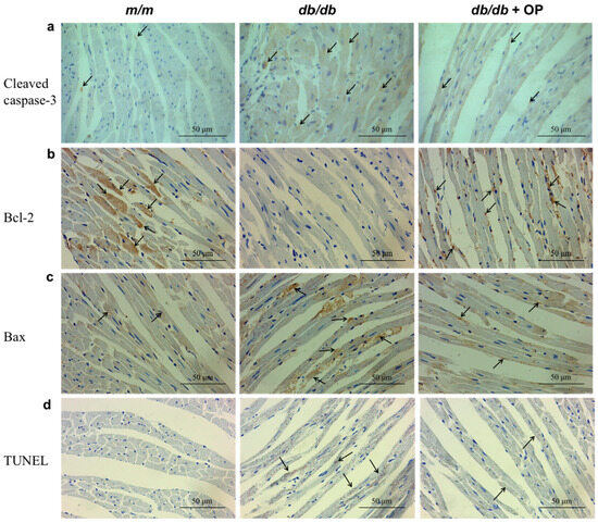 Immunohistochemical staining and TUNEL staining were conducted to assess the level of cardiac apoptosis. Compared with that in the db/db group, the cleaved caspase-3 and Bax expression levels in the db/db + OP group were lower, whereas the Bcl-2 level was higher (Figure 7a–c). In addition, the results of the TUNEL staining were consistent with those of the immunohistochemical staining (Figure 7d). Therefore, our results suggested that OP supplementation can partially inhibit apoptosis in the heart of db/db mice.