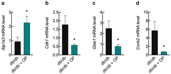 Validation of candidate DEGs using qPCR. (a) mRNA level of Atp1a3 in the kidney; (b–d) mRNA levels of Cdk1, Gtse1, and Ccnb2 in the heart. Results are expressed as mean ± standard error (SEM) (n = 3). * p < 0.05, db/db vs. db/db + OP.