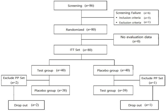 After screening 86 volunteers, 80 were selected (21 men, 59 women) as eligible candidates for the intention-to-treatment set and randomly assigned to the test or placebo groups (n = 40 in each group). Primary analysis for functional evaluation was conducted using the PP set. During the course of the study, three participants withdrew their consent, resulting in dropout (two and one from the test and placebo groups, respectively). Consequently, 77 participants (38 and 39 in the test and placebo groups, respectively) completed all the procedures specified in the human clinical trial protocol. This subset of participants formed the basis of the functional evaluation analysis presented in this study (Figure 1). Participants in this human clinical trial were selected based on their voluntary consent and after assessing their eligibility according to the inclusion and exclusion criteria specified in the clinical trial protocol. This process involved conducting screening tests (Visits 1 and 2). Following the successful completion of the baseline visit procedures (Visit 2), eligible participants were randomly assigned in a 1:1 ratio to either the test or placebo group.