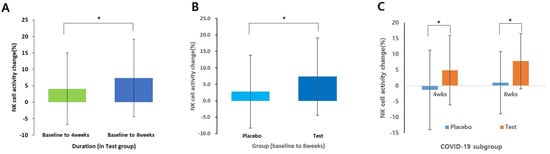 Changes in NK cell activity (%) in the Test group and placebo group (E:T ratios = 50:1): (A) Analyzed using a paired t-test (baseline vs. 8 weeks in test group); (B) Analysis using independent t-test only baseline to 8weeks data; (C) Analysis using independent t-test only COVID-19 subgroup. Data shown mean ± standard deviation. * p < 0.05.