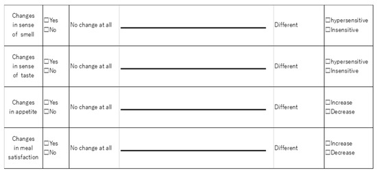The same questionnaire was used for appetite and food satisfaction as for olfaction and taste, and patients who reported a greater decrease in VAS values after surgery than before surgery were defined as having an appetite loss and decreased food satisfaction after surgery, respectively.