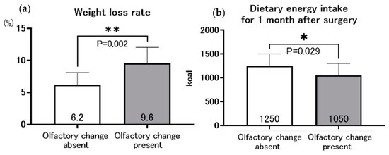 A comparison of the rate of weight loss and oral energy intake at 1 month postoperatively in the group with and without olfactory changes is shown in Figure 4. The rate of weight loss at 1 month postoperatively was significantly greater in the group with olfactory change than in the group without olfactory change (9.6%, 6.2%, respectively; p = 0.002). The energy intake was significantly lower in the group with altered olfactory change than without olfactory change (1050 kcal versus 1250 kcal, respectively; p = 0.029).