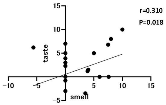 The correlation between postoperative olfactory and taste changes is shown in Figure 5. A weak correlation was observed between olfactory and taste changes (r = 0.310, p = 0.018).