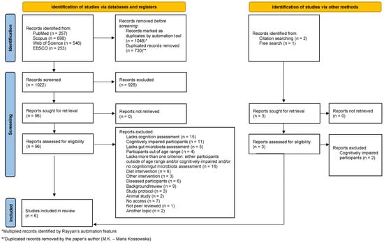 Kossowska, M.; Olejniczak, S.; Karbowiak, M.; Mosiej, W.; Zielińska, D.; Brzezicka, A. The Interplay between Gut Microbiota and Cognitive Functioning in the Healthy Aging Population: A Systematic Review. Nutrients 2024, 16, 852. https://doi.org/10.3390/nu16060852