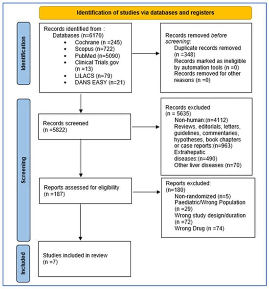 From the initial search of the databases, 6170 studies were identified. After removing duplicate studies, 5822 were screened at the “title and abstract level” and 187 studies at the ‘full-text level’. Finally, seven studies were included in the meta-analysis. The results of the screening process are described in Figure 1.