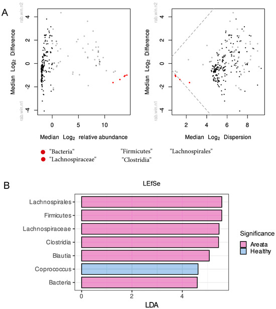(A) Bland–Altman and effect plot of differentially abundant taxa calculated by assessing the fold change of CLR-transformed microbiome counts. Each point on the plot represents a taxonomic feature, colored black if not statistically different between groups, red if identified as significantly different, and grey taxa for which the significance is uncertain. (B) Differentially abundant taxa calculated using linear discriminant analysis and LDA effect size algorithm (LEfSe) with cut-off for LDA score set at 2. Pink colour presents the differentially abundant taxa for Alopecia Areata, while with blue colour for the Healthy.
