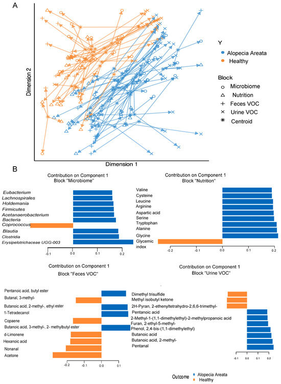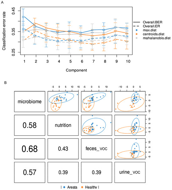 (A) Error rates classification based on the partial least square discriminant analysis (PLS-DA) and added components. (B) First component correlation results from PLS-DA of multi-omic datasets (nutrition, CLR-transformed microbiome count data, urine VOC, and faecal VOC). Blue circles present the Alopecia Areata datapoints while with orange the Healthy.