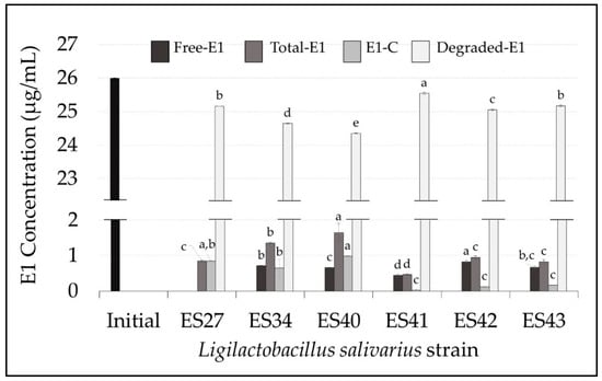 After 48 h of incubation at 37 °C, all the L. salivarius strains tested were able to drastically reduce the initial level of E1. The residual mean values of total E1 in the broth medium ranged from 0.46 ± 0.03 µg/mL (L. salivarius ES41) to 1.65 ± 0.26 µg/mL (L. salivarius ES40). This means an E1 degradation rate ranging from 97% to 99% (Figure 2A).