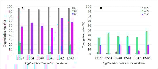 Degradation (A) and conjugation (B) rates of parental estrogens (E1, E2 and E3) after the incubation of the L. salivarius cultures for 48 h at 37 °C.