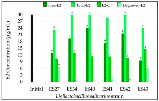 Concentration (µg/mL) of free, total, conjugated and degraded 17β-estradiol (E2) in the cell-free supernatants of the L. salivarius strains included in this study. E1 initial concentration: 30 µg/mL (black bar). Values are expressed as the mean ± SD (n = 3). Conjugated (E2-C): total E2–free E2; degraded E2: initial E2–total E2. Different superscript letters in the same bar color for the different L. salivarius strains mean statistically significant differences (p < 0.05).