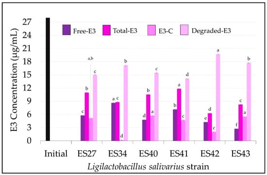 Concentration (µg/mL) of free, total, conjugated and degraded estriol (E3) in the cell-free supernatants of the L. salivarius strains included in this study. E3 initial concentration: 27 µg/mL (black bar). Values are expressed as the mean ± SD (n = 3). Conjugated (E3-C): total E3–free E3; degraded E3: initial E3–total E3. Different superscript letters in the same bar color for the different L. salivarius strains mean statistically significant differences (p < 0.05).