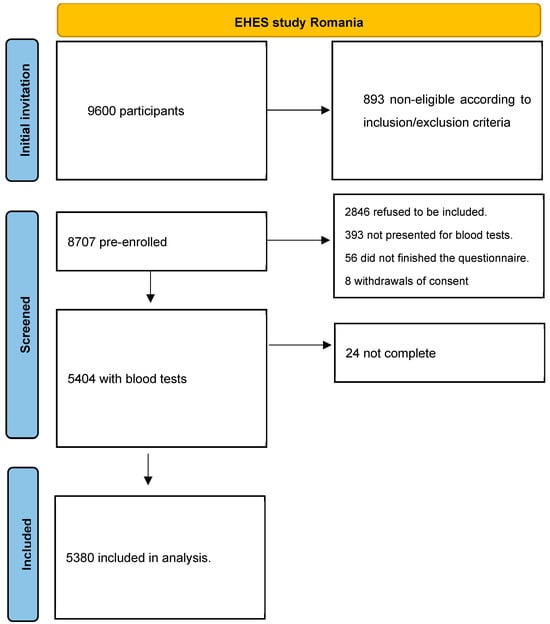 Our analysis was performed under the methodological framework of the European Health Examination Survey (EHES), a European study that provides information about health and risk factors of the population to generate comparable data all over Europe but also for each country []. The study was undertaken in Romania between 5 August and 1 November 2022 with a target population of 9600 people and an estimated response rate of 50%.