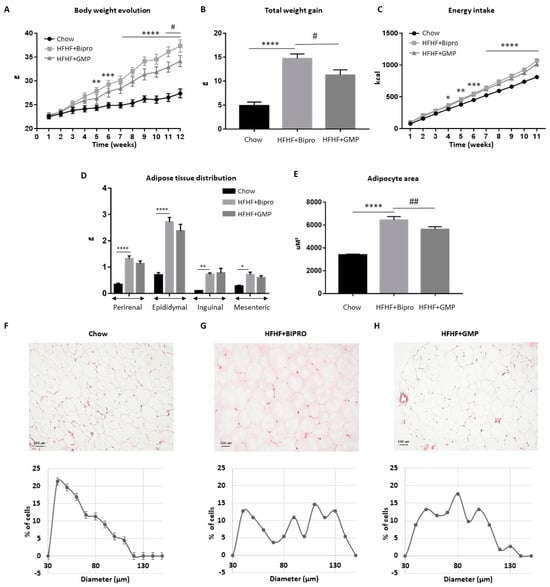 To determine the effect of GMP on diet-induced obesity, mice were fed with either a chow or HFHF diet for 12 weeks. Of note, the administration of Bipro or GMP did not result in any adverse event during the 12-week period. As shown in Figure 1A, administration of the HFHF diet from week 4 to week 12 resulted in a significant increase in body weight compared to the chow group. Although total energy intake was similar between the HFHF + Bipro and HFHF + GMP groups (Figure 1C), GMP supplementation resulted in lower body weight increment and total body weight gain (Figure 1A,B). The difference in body weights between the HFHF + Bipro and HFHF + GMP groups did not appear to derive from differences in perirenal, epididymal, inguinal and mesenteric adipose tissue (Figure 1D). Given the importance of mesenteric adipose tissue in metabolic health, we compared histopathological HPS staining in mesenteric tissues of chow, HFHF + Bipro and HFHF + GMP animals (Figure 1E–H). The calculation of adipocyte cell diameter distribution revealed marked differences among groups. Chow-fed mice displayed the highest proportion (≈22%) of small adipocytes (≈40 μm), with a total absence of adipocytes larger than 120 μm in comparison to HFHF diet-fed mice (Figure 1F). In contrast, HFHF diet-fed mice displayed a low percentage (≈13%) of small adipocytes and a higher proportion (≈14%) of adipocytes ranging from 120 μm to 150 μm (Figure 1G). Interestingly, GMP supplementation led to an adipocyte distribution between chow and HFHF (Figure 1H), suggesting an ameliorated adipose tissue profile. Accordingly, mean adipocyte cell area significantly differed between chow, HFHF + Bipro and HFHF + GMP animals (3385 μm2 ± 74.34, 6438 μm2 ± 305.5 and 5627 μm2 ± 227.2, respectively) (Figure 1E).
