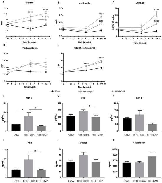 Glycomacropeptide administration prevented systemic insulin resistance and inflammation in high-fat, high-fructose diet-fed mice. At weeks 0, 6 and 10, blood samples were obtained after a 12 h overnight fast to assess insulin resistance and dyslipidemia development in mice (n = 8/group). (A) Glycemia, (B) insulinemia and (C) homeostatic model assessment of insulin resistance (HOMA-IR), (D) triglyceridemia and (E) total cholesterolemia. At the end of the 12-week experiment, plasma was collected to characterize mouse inflammatory profiles (n = 8/group). The following cytokines were found to be modulated by GMP treatment: (F) MCP-1, (G) MIG, (H) MIP-2, (I) TNF-α and (J) RANTES. (K) Adiponectin concentration was also determined as described in the Materials and Methods section. Data are expressed as the mean ± SEM. Versus chow: * p < 0.05, **** p < 0.0001; versus HFHF + Bipro: # p < 0.05, ### p < 0.001, #### p < 0.0001. MCP-1: monocyte chemoattractant protein; MIG: monokine induced by gamma interferon; MIP-2: macrophage inflammatory protein; TNF-α: tumour necrosis factor alpha; RANTES: regulated on activation, normal T cell expressed and secreted.