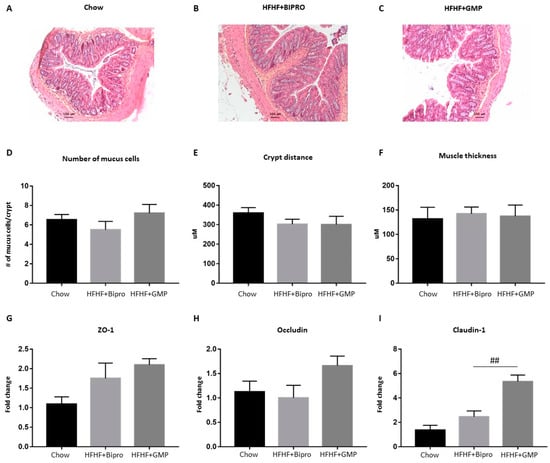 Impact of glycomacropeptide treatment on intestinal morphology and permeability. Cross-sections of distal colon tissue were stained with hematoxylin and eosin (H&E) to evaluate GMP’s impact on intestinal morphology. Representative images of colon sections of (A) chow, (B) HFHF + Bipro and (C) HFHF + GMP mouse groups are presented (magnification × 200, scale bars = 100 μm). Histological parameters including (D) number of mucus cells per crypt, (E) crypt distance and (F) muscle thickness. Data are shown as the mean ± SEM. Gene expression of tight junction proteins (G) ZO-1, (H) occludin and (I) claudin-1 was determined by RT-qPCR, as described in the Materials and Methods section. Data are expressed as the mean ± SEM (n = 4–8/group). Versus HFHF + Bipro: ## p < 0.01. ZO-1: zonula occludens-1.