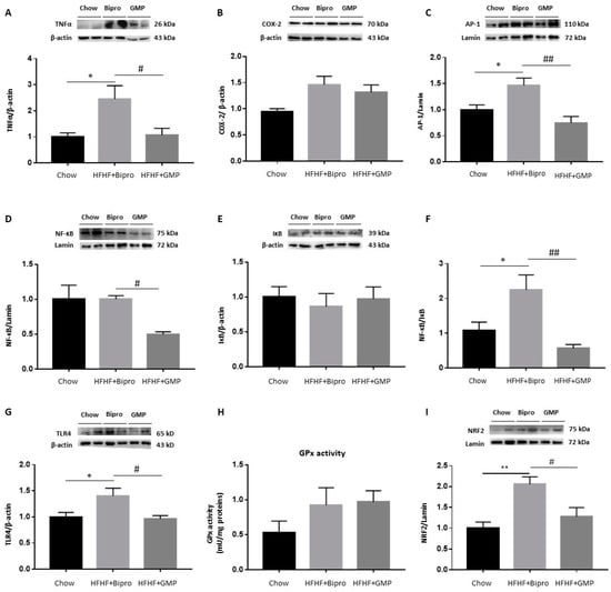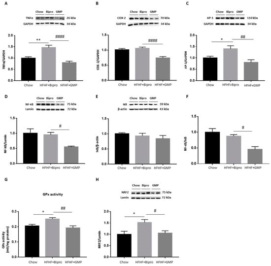 Similar to what was observed in the distal colon, GMP strongly attenuated inflammation in the liver, as evidenced by reduced protein expression levels of TNF-α, COX-2, AP-1 and NF-κB (Figure 9A–D). The calculation of the NF-κB/IκB ratio using NF-κB and IκB protein expression results confirmed this trend (Figure 9D–F). As for OxS status in the liver, HFHF + Bipro feeding increased GPx activity, while GMP supplementation restored it to chow-fed mice levels (Figure 9G). Following the same trend as GPx activity, Western blotting revealed a strong activation of NRF2 by HFHF + Bipro feeding, which was neutralized by GMP supplementation (Figure 9H).