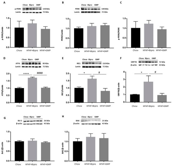 As ER stress plays a key role in the pathogenesis of NAFLD, liver protein expression of PERK, ATF6 and IRE1 was evaluated by Western blot (Figure 10B–D). The protein expression of GRP78 and GRP94, two major chaperones involved in the initiation of UPR in the liver, was also assessed (Figure 10E,F). HFHF + Bipro feeding resulted in a reduction of PERK and IRE1, as well as their main chaperone GRP78 (Figure 10B,D,F), while no change was detected in ATF6 or GRP94 protein expression (Figure 10C,E). Compared to HFHF + Bipro-fed mice, GMP-supplemented mice displayed increased levels of p-PERK (Figure 10A) and reduced levels of ATF6 (Figure 10C).
