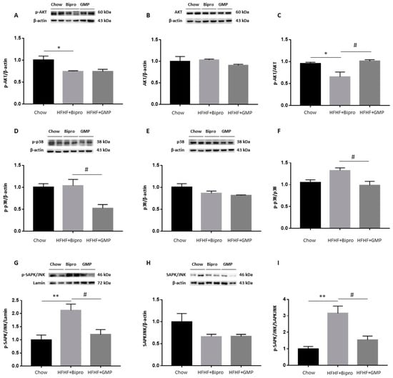 Glycomacropeptide increases gut insulin sensitivity, modulates insulin signalling and downregulates mitogen-activated protein kinases. Protein expression of important biomarkers involved in the insulin signalling cascade was determined by Western blot in mice colons: (A) phospho-AKT, (B) AKT, (D) phospho p38-MAPK, (E) p38-MAPK, (G) phospho SAPK//JNK and (H) SAPK/JNK. The ratios of (C) phospho AKT/AKT, (F) phospho p38-MAPK/p38-MAPK and (I) phospho SAPK-JNK/SAPK-JNK were then calculated. AKT and p38 proteins were assayed on the same membrane using their specific antibodies and shared the same reference protein β-actin. Results represent the mean ± SEM (n = 4 /group). Versus chow: * p < 0.05, ** p < 0.01; versus HFHF + Bipro: # p < 0.05. MAPK: mitogen-activated protein kinase; SAPK: stress-activated protein kinase; JNK: jun amino-terminal kinase.