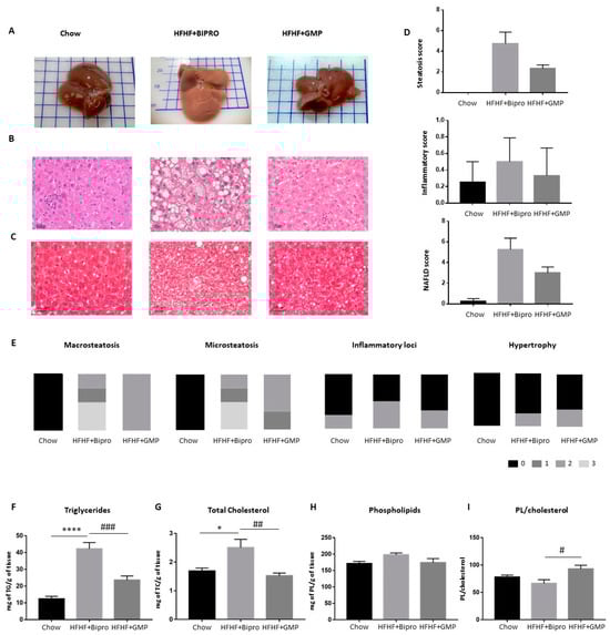 Since HFHF feeding promotes hepatic fat deposition and the development of NAFLD, histopathology based on HPS and Masson’s trichrome staining as well as biochemical analyses were performed to assess liver status. Liver pictures, histopathological HPS and Masson’s trichrome staining demonstrated clear differences in lipid droplet size and number between chow, HFHF + Bipro and HFHF + GMP animals (Figure 8 A–C). As a matter of fact, the mean steatosis score was 4.75 for HFHF + Bipro compared to 2.33 for the HFHF + GMP group (Figure 8D). Compared to chow-fed animals, HFHF diet-fed mice displayed a higher inflammatory score that was substantially restrained by GMP treatment. A combination of both indices to calculate the NAFLD index revealed a marked attenuation of the score (5.25 versus 3) following treatment with GMP. Figure 8E details histological parameters used in NAFLD scoring, including macrosteatosis, microsteatosis, inflammatory loci and hepatocyte hypertrophy. It is noteworthy that a greater proportion of HFHF + Bipro mice displayed scores of 2 and 3 when evaluated for micro and macrosteatosis, whereas a majority of HFHF + GMP mice presented with scores of 1 or 2, suggesting less severe fat deposition.