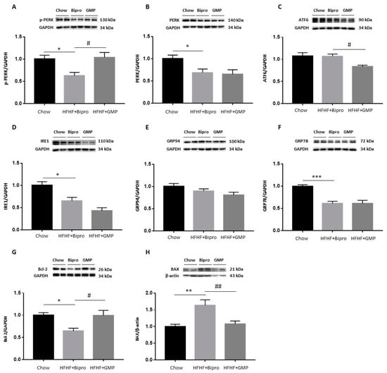 Glycomacropeptide did not prevent endoplasmic reticulum stress in the liver but averted its transition into apoptosis. Protein expression of endoplasmic reticulum (ER) stress markers (A) p-PERK, (B) PERK, (C) ATF6, (D) IRE1, (E) GRP94, (F) GRP78, (G) Bcl-2 and (H) BAX was assessed by Western blot in hepatic tissues. p-PERK and IRE1; PERK and GRP94; ATF6, GRP78 and p38 (Figure 11B), respectively, were assayed on the same membrane using their specific antibodies and shared the same reference protein GAPDH. Data are expressed as the mean ± SEM (n = 4–8/group). Versus chow: * p < 0.05, ** p < 0.01, *** p < 0.001; versus HFHF + Bipro: # p < 0.05, ## p < 0.01. PERK: phospho protein kinase RNA-like ER kinase; ATF6: activating transcription factor 6; IRE1: inositol-requiring enzyme 1; GRP: glucose-regulated protein; Bcl-2: B-cell lymphoma 2; BAX: Bcl2-associated X protein.