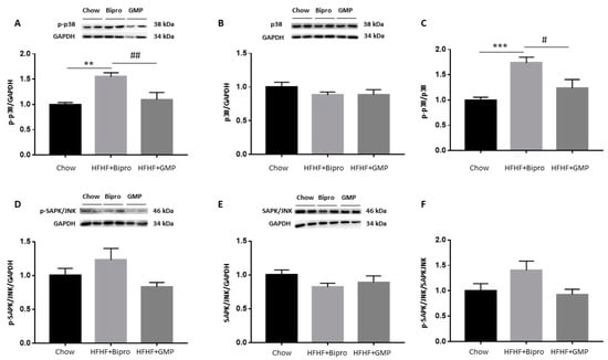 Modulation of insulin signalling in high-fat, high-fructose diet-fed mice livers by glycomacropeptide. Protein expression of major biomarkers involved in insulin signalling cascade was determined by Western blot in mice livers: (A) phospho p38-MAPK, (B) p38-MAPK, (D) phospho SAPK/JNK and (E) SAPK/JNK. The ratios of (C) phospho p38-MAPK/p38-MAPK and (F) phospho SAPK-JNK/SAPK-JNK were then calculated. Results represent the mean ± SEM (n = 4–8/group). Versus chow: ** p < 0.01, *** p < 0.001; versus HFHF + Bipro: # p < 0.05, ## p < 0.01. MAPK: mitogen-activated protein kinase; SAPK: stress-activated protein kinase; JNK: jun amino-terminal kinase.