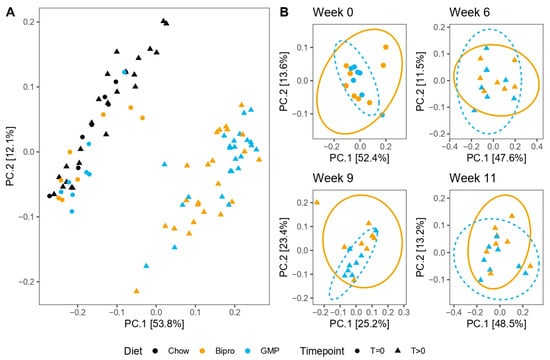 A high-fat, high-fructose diet dramatically shifted the microbiota composition over time regardless of glycomacropeptide supplementation. Principal coordinate analyses using the weighted Unifrac distance for all mouse stool samples (A) and the GMP/Bipro-fed mice at each sampling week (B). Ellipses represent the 95% confidence intervals for each group.