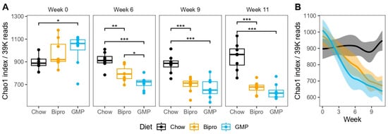 High-fat, high-fructose diet led to reduced species richness regardless of glycomacropeptide supplementation. Chao1 index between feeding groups at each sampling time point (A) and over time (B). Boxplots (A) show the interquartile range, with the median represented as a line. Changes over time (B) are represented as LOWESS fits to the data, with shaded regions denoting 95% confidence intervals. p < 0.5 *, 0.01 ** and 0.001 *** (note: only significant associations are plotted).