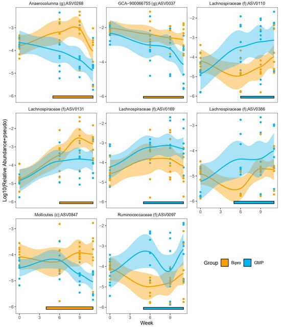 Glycomacropeptide had differing impacts on microbial abundance over time. Selected amplicon sequence variants (ASVs) identified as having differential abundance patterns over time. ASVs are shown with their lowest taxonomic annotation. ASV relative abundance was log10-transformed, with a pseudocount added as required. Points represent each sample, with lines representing LOWESS fits and shaded regions denoting 95% confidence intervals. Bars along the x-axis highlight the time spans identified as showing different abundance patterns, with the colour representing which group was enriched for each time period.