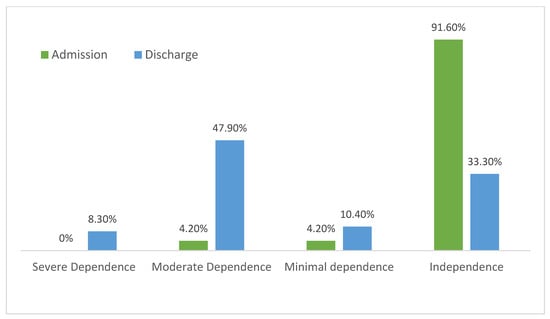 The proportion of patients with severe, moderate, and mild dependency increased from admission to discharge (Figure 1).