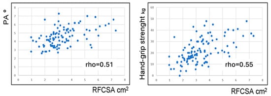 Correlation of RF-CSA with PA and handgrip strength. Abbreviations: PA, phase angle; RF-CSA, rectus femoris cross-sectional area.