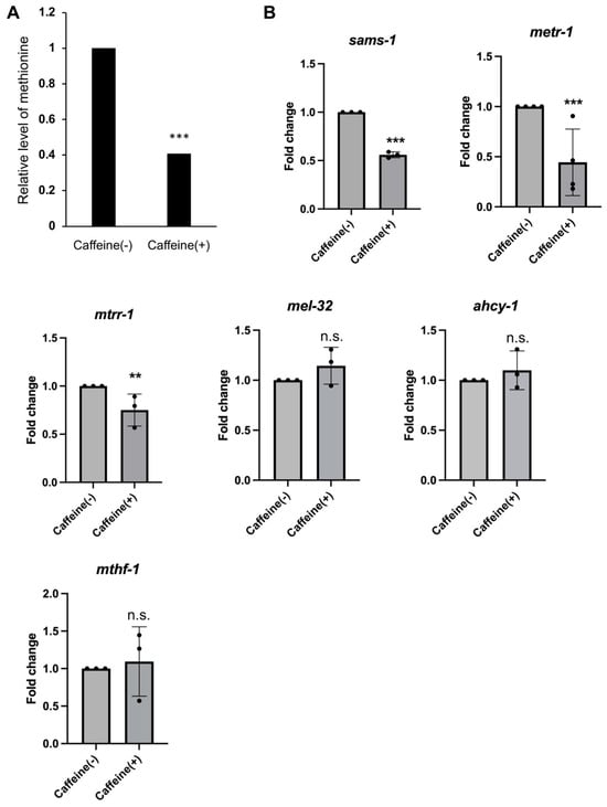 Caffeine intake caused alterations in methionine metabolism in C. elegans. (A) Fold change in methionine between the caffeine (−) and the caffeine (+) animals using gas chromatography. In total, 5000 adult animals were extracted to determine the methionine level for each group. p values were calculated using Student’s t-test. (B) Fold induction in mRNA of sams-1, metr-1, mtrr-1, mel-32, ahcy-1, and mthf-1 in CIAs. p values were calculated using Student’s t-test. *** p < 0.001. ** p < 0.005. n.s., not significant. Error bars represent SD.