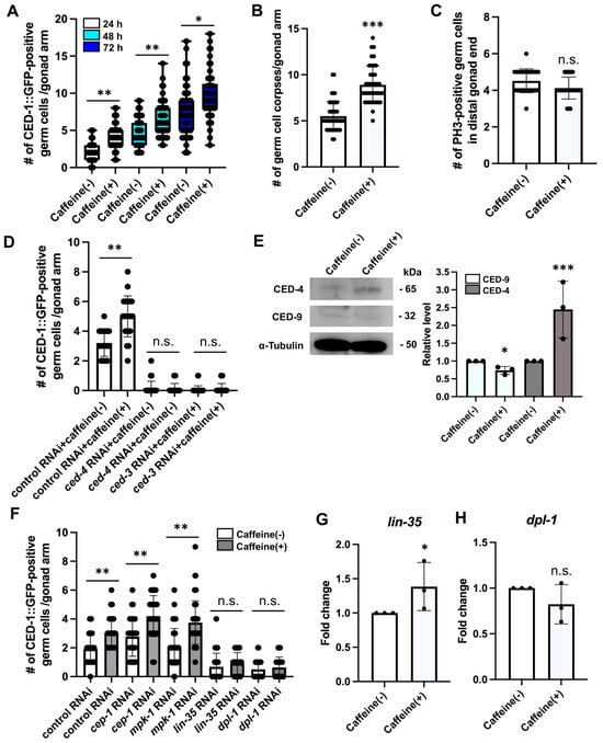 Caffeine intake increased germ cell apoptosis in an LIN-35/RB-dependent manner. (A) The number of apoptotic germ cells in MD701 transgenic animals treated with or without caffeine at 20 °C for 24 h, 48 h, and 72 h after the L4 stage. n > 30 in each condition. **, p < 0.005. *, p < 0.01 (one-way analysis of variance (ANOVA) with Tukey’s post hoc test). (B) The number of germ cell corpses in ced-1(e1735) mutants treated with or without caffeine at 20 °C for 24 h after the L4 stage. n > 30 in each condition. ***, p < 0.001 (Student’s t-test). (C) The number of PH3-positive germ cells in wild-type animals treated with or without caffeine at 20 °C for 24 h after the L4 stage. n > 30 in each condition. n.s., not significant (Student’s t-test). (D) The number of apoptotic germ cells by RNAi depletion of mock, ced-4, and ced-3 in MD701 transgenic animals treated with or without caffeine at 20 °C for 24 h after the L4 stage. n > 30 in each condition. **, p < 0.005. n.s., not significant (ANOVA with Tukey’s post hoc test). (E) Western blot analysis of CED-4 and CED-9 in wild-type animals treated with or without caffeine at 20 °C for 24 h after the L4 stage. n > 300 in each condition. ***, p < 0.001. *, p < 0.01 (Student’s t-test). (F) The number of apoptotic germ cells by RNAi depletion of mock, cep-1, mpk-1, lin-35, and dpl-1 in MD701 transgenic animals treated with or without caffeine at 20 °C for 24 h after the L4 stage. n > 30 in each condition. **, p < 0.005. n.s., not significant (ANOVA with Tukey’s post hoc test). (G,H) Fold induction in mRNA of lin-35 (G) and dpl-1 (H) in CIAs. p values were calculated using Student’s t-test. *, p < 0.01. n.s., not significant. Error bars represent SD.