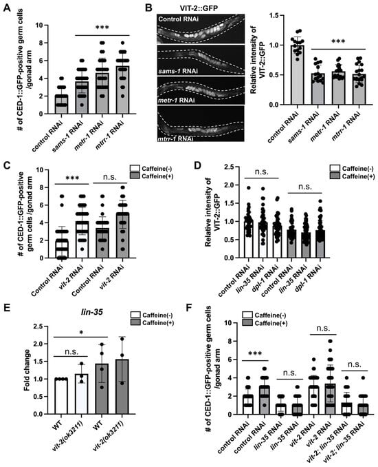 Next, we confirmed whether the activity of genes essential for the methionine cycle affects germ cell apoptosis by RNAi depletion of sams-1, metr-1, and mtrr-1, which showed reduced mRNA transcript levels after caffeine intake (Figure 2B). We found that the RNAi depletion of sams-1, metr-1, or mtrr-1 increased germ cell apoptosis (Figure 4A), suggesting that methionine metabolism is involved in physiological germ cell apoptosis. Next, we investigated whether vitellogenesis is affected by alterations in methionine metabolism in CIAs. We measured the level of vitellogenesis in transgenic animals carrying an integrated VIT-2::GFP transgene after the simultaneous depletion of sams-1, metr-1, or mtrr-1 to suppress methionine metabolism. As reflected in the germ cell apoptosis phenotype due to impaired methionine metabolism, we observed that vitellogenesis was also significantly reduced by the RNAi depletion of sams-1, metr-1, and mtrr-1 compared to the control group (Figure 4B). Furthermore, when CED-1::GFP transgenic animals with vit-2 RNAi depletion were examined, the number of apoptotic germ cells significantly increased. However, the number of apoptotic germ cells in CIAs with vit-2 RNAi depletion was comparable to that in the control group in CIAs (Figure 4C). These results suggest that vitellogenesis also affects physiological germ cell apoptosis and that caffeine intake and vitellogenesis share the same pathway to increase germ cell apoptosis.