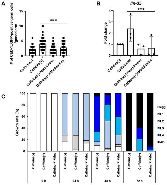 We found that the reduction in both reproduction and vitellogenesis by caffeine intake was improved by vitamin B12 supplementation, which is an important co-factor in methionine metabolism in a previous study. Considering these previous findings, we tested whether methionine supplementation plays a beneficial role in caffeine-induced germ cell apoptosis. We first tested whether methionine supplementation recovers the level of germ cell apoptosis in CIAs and found that the elevated level of germ cell apoptosis induced by caffeine intake was significantly reduced in CIAs with methionine supplementation (Figure 5A, Supplementary Materials Figure S3). We also confirmed that the increased level of lin-35 mRNA transcript caused by caffeine intake was significantly decreased by methionine supplementation (Figure 5B), indicating that methionine supplementation plays a beneficial role in decreasing the level of germ cell apoptosis induced by caffeine intake. Maternal caffeine intake has been shown to retard offspring development by reducing vitellogenesis in C. elegans []. Therefore, we tested whether methionine supplementation could contribute to offspring growth in CIAs. We evaluated the subsequent F1 generation in CIAs with methionine supplementation. Interestingly, caffeine-fed mothers displayed a significant improvement in offspring developmental growth rate (approximately 59.5% adults with caffeine and 92.0% adults with caffeine + methionine supplementation at 72 h of growth). These results suggest that methionine supplementation has a beneficial effect on both caffeine-fed mothers and their subsequent generation.