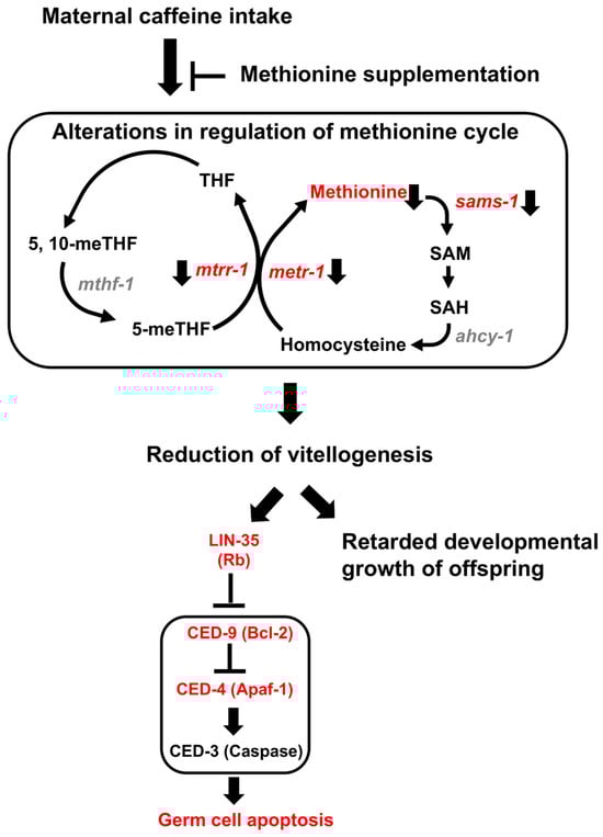 The previous study showed that maternal caffeine intake negatively affected offspring development in a C. elegans model []. In this study, we investigated the physiological alterations affecting germ cell health and offspring development following maternal caffeine intake. We found that maternal caffeine intake decreased methionine levels, which seemed to be due to the reduced expression of sams-1, metr-1, and mtrr-1, which are essential for the methionine cycle. The decreased amount of methionine resulted in a reduction in vitellogenesis, thus increasing the level of apoptosis in the germline and decreasing developmental growth in the offspring (Figure 6). Surprisingly, when methionine was supplemented in CIAs, the negative effects of maternal caffeine intake were alleviated.