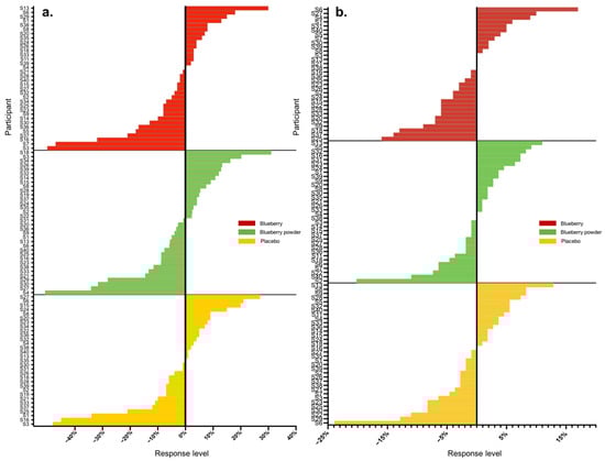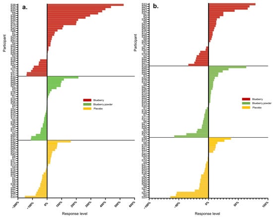 For the endpoints assessing cognition and mood, most participants demonstrated no changes. The cognitive tasks for the current study were selected based on previous evidence of the sensitivity to nutritional interventions [,]. The complex regulatory mechanisms of the cerebral blood flow and cognition may explain the lack of intra-individual changes in cognitive performance following the interventions []. It is interesting to notice that, following a Mediterranean diet, the inter-individual difference in the alertness score was also higher (+6.93 of response change) compared to contentedness (+5.35 of response change) and calm (−0.28 of response change) based on the visualised rating scale []. The current study observed a similar trend for alertness (−70 to +59%) compared to contentedness (−41 to +41%) and calm (−39 to +60%). The inter-individual variations were not limited to the mood assessment though. Inter-individual differences in cerebral blood flow dynamics, neural correlates, heritability, physical and social environment and personality all constitute complex associations between individual responses and specific cognitive domain phenotypes. We have recently shown [] a larger variation across studies assessing memory (SD of 2.2) relative to executive function (SD of 0.08–0.16) following either a blueberry powder or blueberry concentrate intervention [,,]. However, in the current study, working memory, episodic memory and attention all demonstrated moderate to high variations (−39–+61%), and only one participant showed an improved response across working memory, episodic memory and attention, but not mood, assessments after the blueberry powder intervention. No other participants had a consistent response across the cognitive endpoints, so the response in terms of cognitive abilities also seemed random across domains.