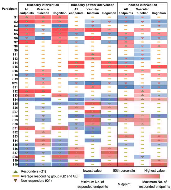 Most participants showed random responses across the vascular and cognitive endpoints following the interventions and also for the placebo control. For example, participant S3 showed the highest response in PWV following the whole blueberry intervention and placebo intervention but had the lowest response for the blueberry powder intervention. For the attention assessment, participant S2 showed the lowest response following the placebo intervention, but moderate and high responses following the blueberry powder and blueberry interventions, respectively. Similarly, participant S18 demonstrated the lowest response following the placebo intervention, but a moderate response following the blueberry powder and blueberry interventions. Participant S2 had improved responses for most vascular and cognitive endpoints following both blueberry interventions. Participant S2 also showed consistently improved responses in the cognitive assessments after the blueberry powder intervention and consistently worsened responses in the cognitive assessments after the placebo intervention, although not in regard to vascular function. Participants S19 and S25 showed consistently improved responses for vascular function following both the blueberry and blueberry powder interventions, but their responses regarding cognitive function appeared random. Figure 2 also highlights the differences between the placebo and treatment groups when there was a larger effect on the endpoint—in this case, plasma nitrite (Figure 2a). The responses for each participant across the endpoints are visualised as a heat map in Figure 3. Again, this figure demonstrates that there was little consistency in the responses across both the vascular and cognitive endpoints in each intervention and even between the similar blueberry treatments.