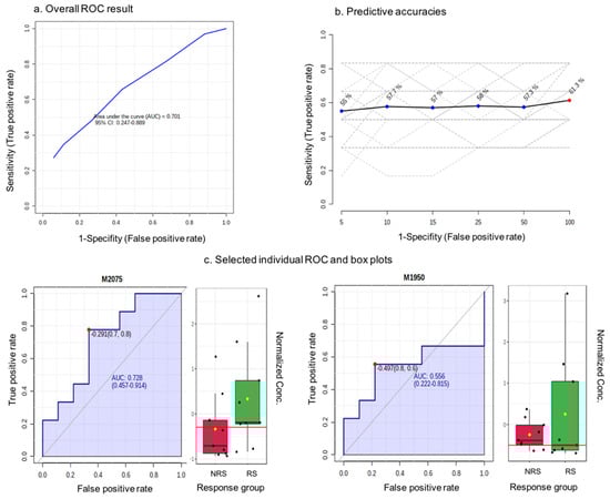 Post-data-acquisition processing and alignment was performed using Compound Discoverer™ and data were categorised into different treatment groups for analysis. Pooled QC samples and sample blanks were also included and grouped accordingly in order to assess and evaluate system stability and track potential carryover effects throughout the entire batch analysis. The resulting peak table was sequentially filtered using QC parsing with a 30% relative standard deviation (RSD) to screen out features that showed instability or irreproducibility across the dataset, reducing the original feature list. Datasets were grouped by treatment, pre- and post-treatment and RS and NRS groups separately and uploaded to MetaboAnalyst 5.0 [] for univariate statistical analysis and multivariate chemometric analysis using the statistical analysis (one factor) module. The non-parametric relative standard deviation (median absolute deviation [MAD]/median) was used to filter untargeted metabolomics datasets (i.e., spectral binning data, peak lists) with a large number of variables to screen out baseline noise [], while log transformation helped to remove heteroscedasticity from the data and correct for a skewed data distribution. Autoscaling was used to remove the dependence of the ranking of the metabolites on the average concentration and the magnitude of the fold changes and showed biologically sensible results after principal component analysis []. For biomarker identification, the biomarker analysis module of MetaboAnalyst™ was used, which comprises receiver operating characteristic (ROC) curve analysis and random forest classification models.